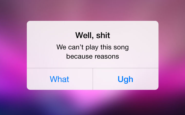 Now, the surge in songs we can’t download or stream is a pain, but the re-introduction DRM is a brick wall. Not only can we not play DRMed songs, but DJ apps can’t even detect their presence. An enterprising developer may find that the AVAsset API has a property hasProtectedContent that sounds like it would help. Unfortunately, to get an AVAsset you need an asset URL, and if you ask for the URL of a DRMed MPMediaItem, you just get nil – the same value you get if it’s an iTunes Match track. Or an iTunes in the Cloud track. Or an Apple Music track. Or a really bad cover of Billy Ray Cyrus’ Achy Breaky Heart and it is currently a Thursday.