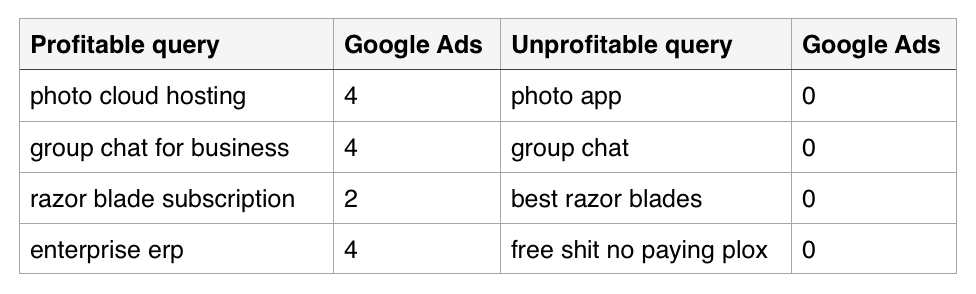 Showing ads, you see, comes at the cost of slowly training viewers to tune them out. Given this, we see veterans like Google presenting no ads at all for most queries. If a search term doesn’t drive demand for highly priced legitimate ads, no ads will appear. Meanwhile, profitable keywords, which Google refers to as “highly commercial queries”, often have an entire screen full of ads before the first organic result.