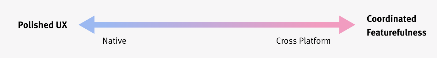 So instead of a straightforward “good vs. cheap” tradeoff, we get a kind of non-linear tradeoff where the teams trying to coordinate the most feature work across the most number of platforms feel an incredible gravity towards cross-platform tools – even if a high priority on UX would predispose them to building native clients. On mobile platforms, where teams are often more disciplined about features and more focused on UX polish, the tradeoff is a bit different and teams more often go native than they do on desktop.